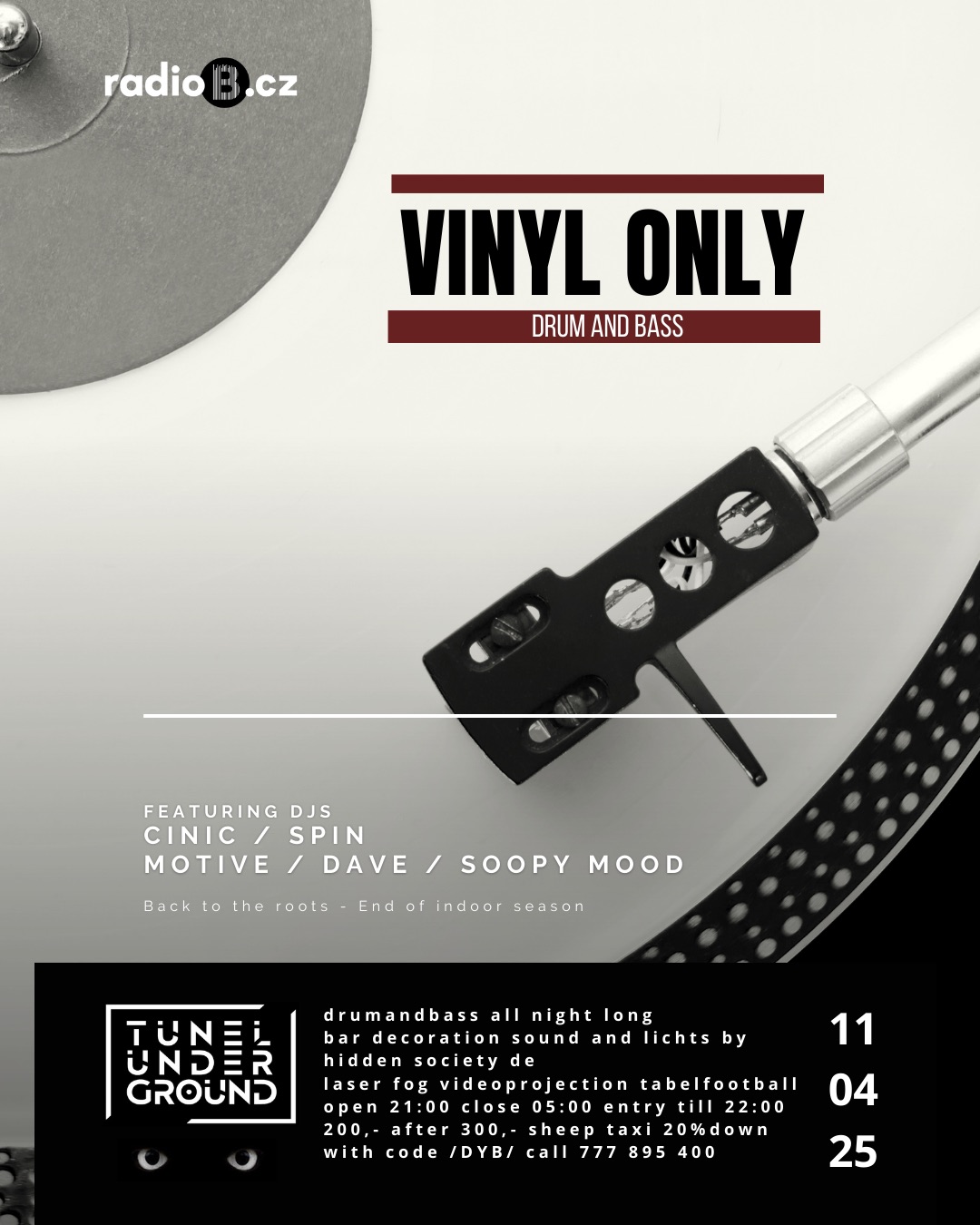 Na vinylech jsme začínali a je fakt že dlouho nehrali a proto je na čase změna. Nedávného hraní v děčínském čajovém klubu Ve Vlnách a neuvěřitelného citového a sluchového vibu mne utvrdilo pro uspořádání čistě vinylového DNB večírku, palby, kalby..... Hluboké bassové linky, autentický zvuk. Vinyl zůstává ikonickým formátem nejen v dnb kultuře. Sami pocítíte.