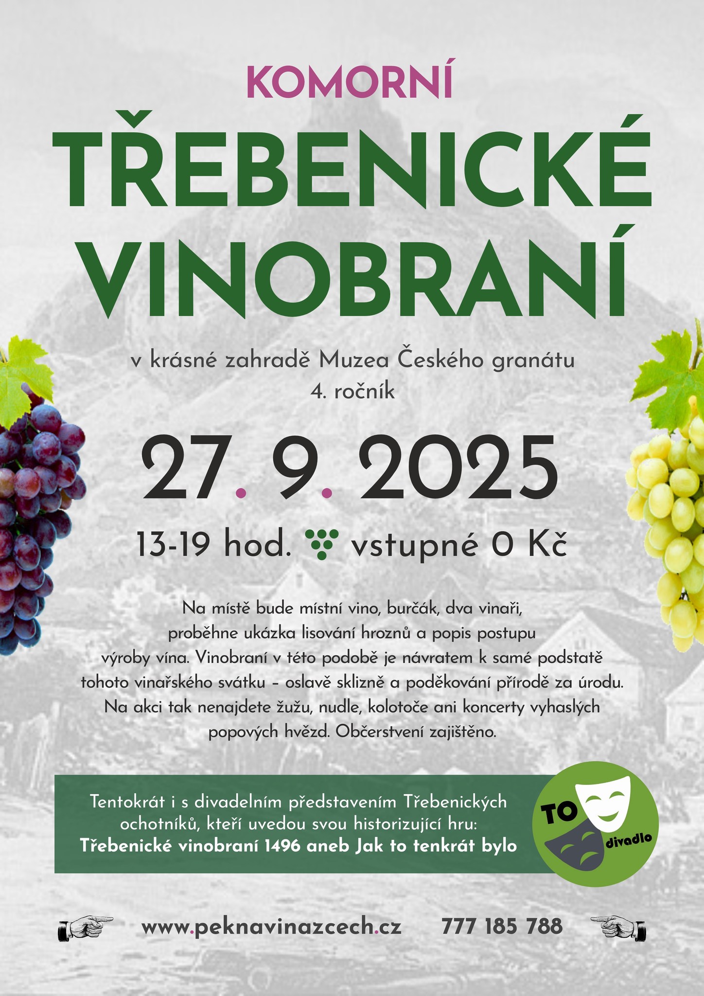 Další ročník Komorního Třebenického vinobraní je tady. Oslavíme letošní sklizeň - a tentokrát zřejmě bude co slavit - v zahradě Muzea českého granátu v Třebenicích. Bude místní víno, bude burčák, boudou dobroty, bude ukázka výroby vína a pozor! letos si speciálně pro tuto příležitost připravili Třebeničtí ochotníci svoji vlastní divadelní hru. Zhruba dvacetiminutové představení odehrají dvakrát. Poprvé v 15 hodin, podruhé v 17 hodin.